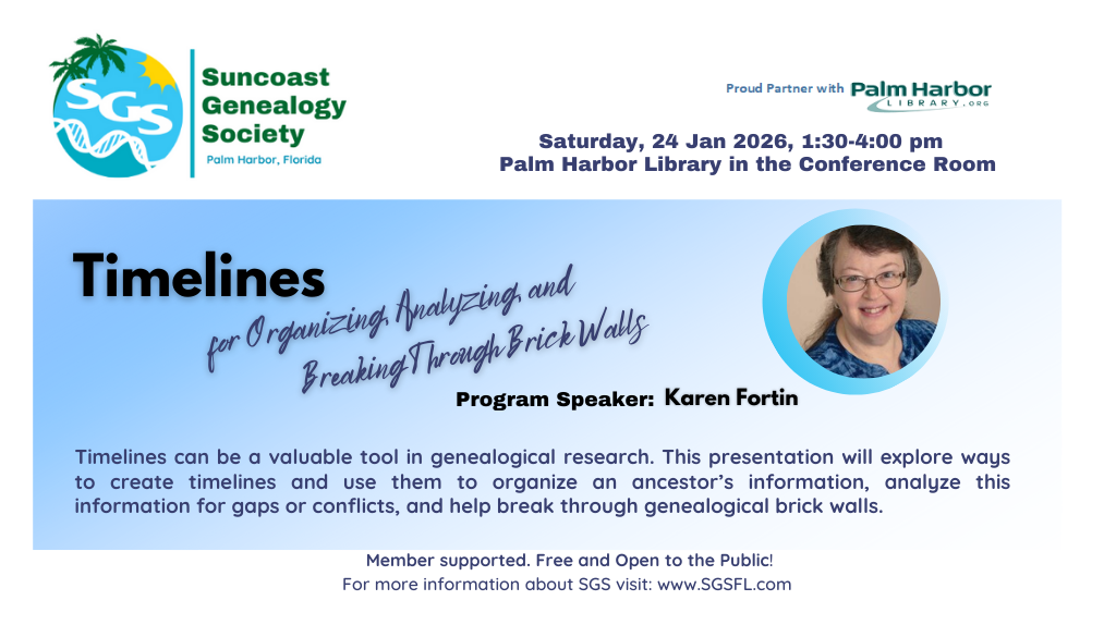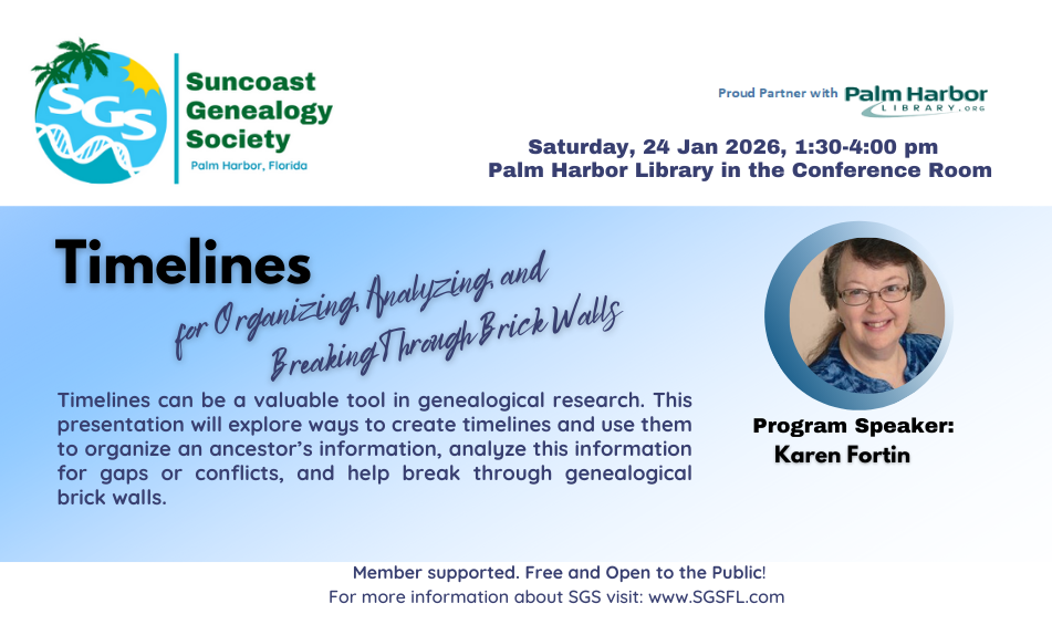 - The next SGS meeting is on January 24nd @ 1:30 PM at the Palm Harbor Library conference room. We will have a presentation on Timelines by Karen Fortin.