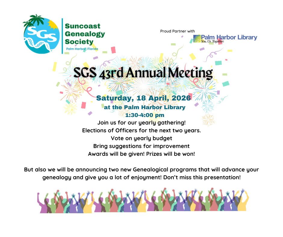 - The next SGS meeting is on April 18th (not 25th!!!) @ 1:30 PM at the Palm Harbor Library. We will have our 43rd anniversary meeting and elect officers and approve our budget, and more – see below for more info.